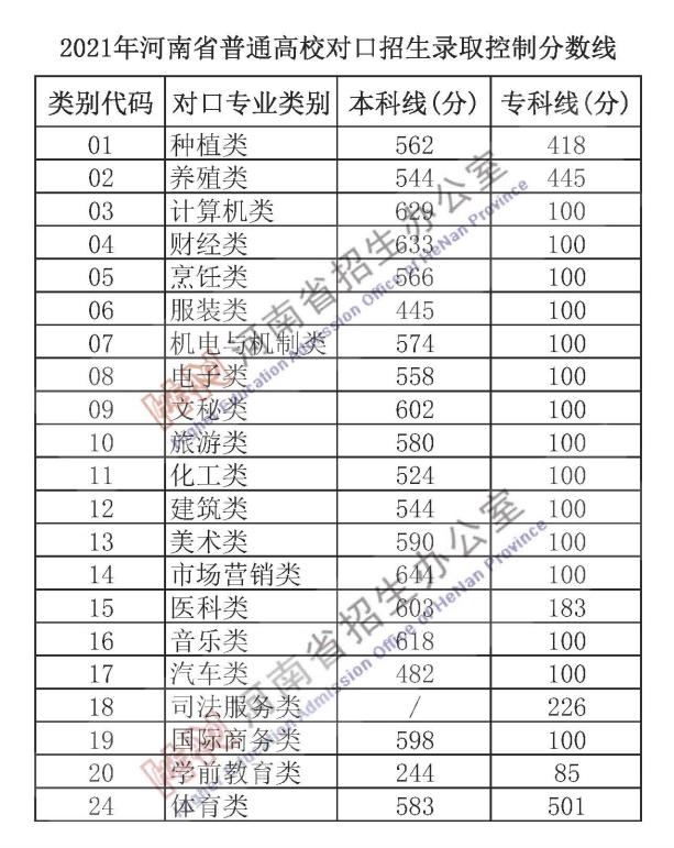 2021年河南省普通高校招生录取控制分数线