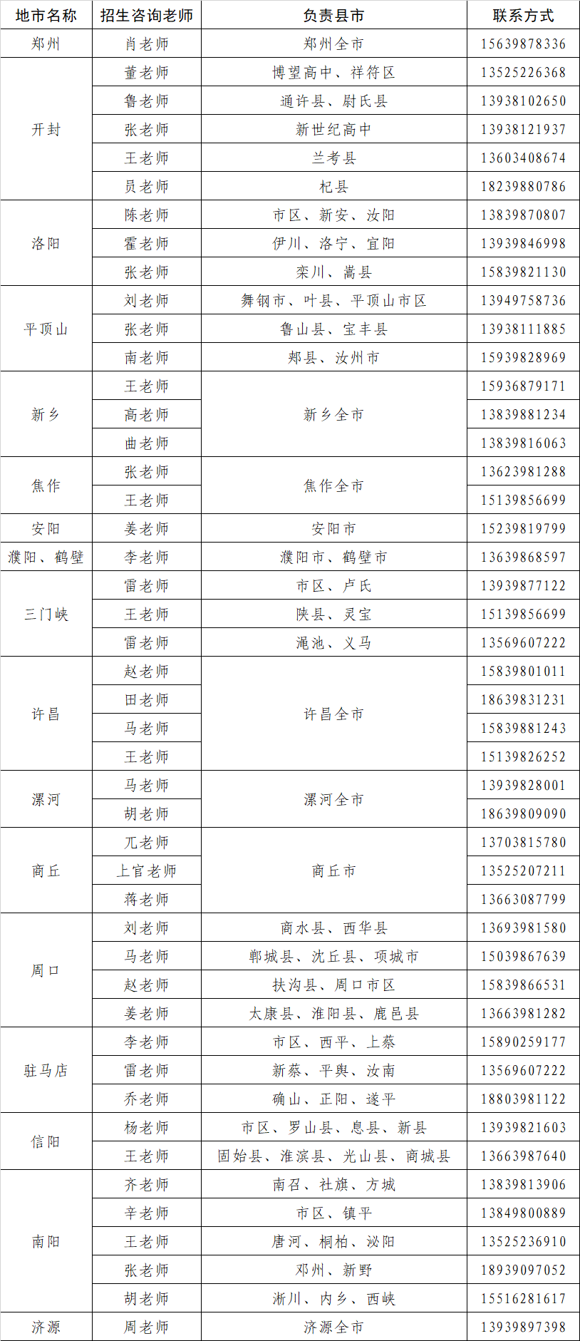 2025年河南省各地市招生咨询老师联系方式